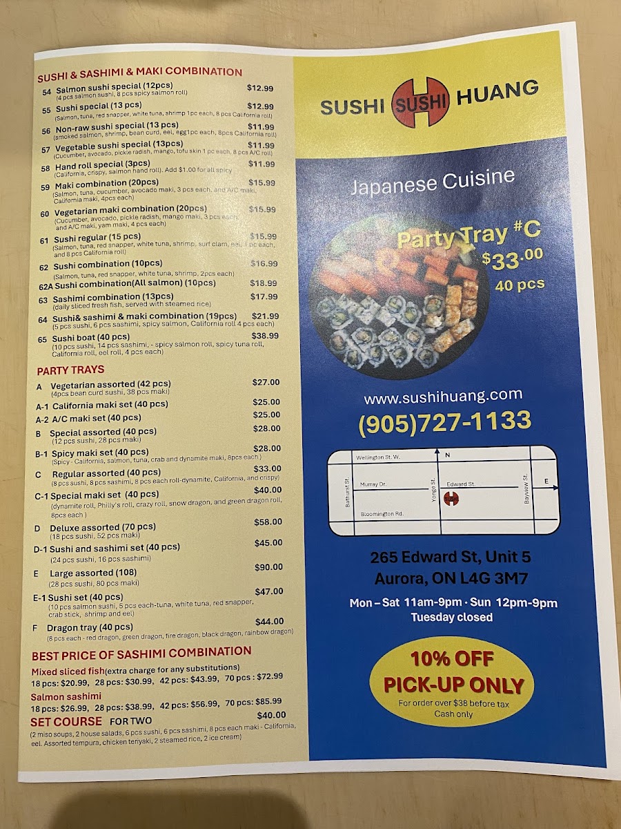 Discover the vibrant flavors of Japan right in the heart of Aurora at Sushi Huang Japanese Cuisine. Located at 265 Edward St, Aurora, ON L4G 3M7, this restaurant promises a delightful culinary experience that will transport your taste buds straight to Asia.