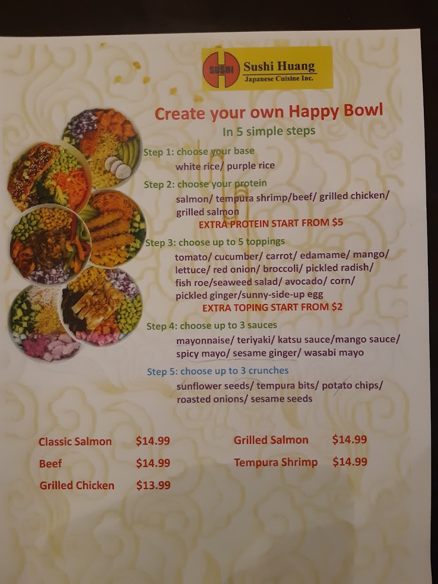 Sushi Huang specializes in authentic Japanese cuisine, offering a diverse menu filled with delectable options for sushi lovers and newcomers alike. Indulge in their Jumbo Size Special Roll, the tantalizing TNT Roll, or savor the richness of the Shrimp Tempura Roll—a delightful combination of crispy shrimp tempura, fresh cucumber, refreshing lettuce, and flavorful mayo. With each roll priced at CA$11.99, you'll find an exquisite blend of flavors and textures that elevate your dining experience.